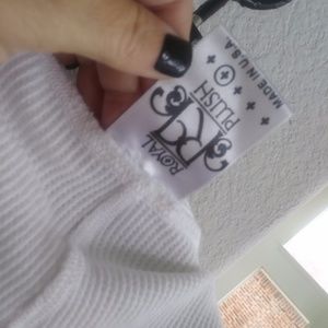 THIS IS A CUTE AND STYLISH HOODIE.MADE BY ROYAL PLUSH A DESIGNER THAT MAKES REALLY CUTE EDGY TYPE STYLES I BOUGHT QUITE A FEW OF THEIR ITEMS THEY USUALLY HAVE SWAROVSKI CRYSTALS ON THEM. VERY HIGH END DESIGNER, NICE QUALITY. THIS DID NOT COME WITH TAGS IT CAME IN A BAG LIKE VICTORIA'S SECRET ITEMS DO WHEN ORDERED FROM THEIR WEBSITE.
