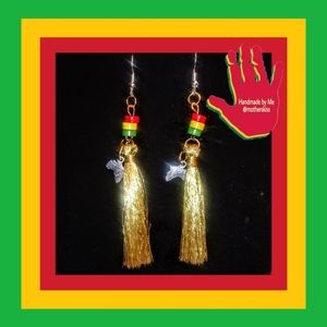 Golden tassel Rasta themed earrings with stainless steel Africa pendants on stainless steel french hooks. Handmade.