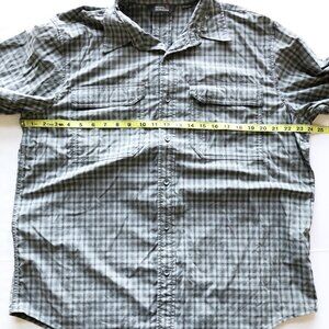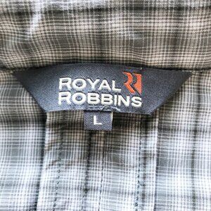 Royal Robbins green plaid button up long sleeve shirt. Size large, 2 front pockets, roll tab sleeves, button cuffs, nylon spandex blend. Excellent pre-owned condition, no flaws or defects. Smoke and pet free home.