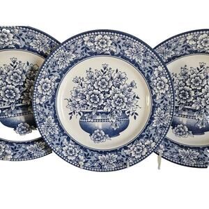 These plates are stunning!! They are beautifully detailed and designed. The set of 3 ceramic Dinner Plates are 11" diameter and are dishwasher and microwave safe. The plates are blue and white with a pot of flowers and floral trim. Royal Stafford dinnerware sets are made in England so you know they are very high quality. They would make a beautiful addition to your dining room!