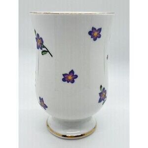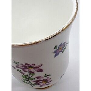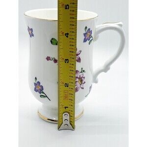 This beautiful Victoria Bone China Mug is perfect for any occasion, be it a cup of tea or coffee. The exquisite floral pattern in shades of purple adds a touch of elegance to your day. This collectible item stands at 4.5 inches tall and has a capacity of 8 oz. Refer to photos as part of the description. There is some light wear to the gold trim on the rim.