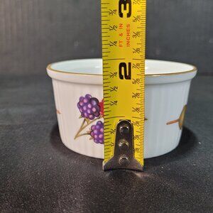 The ROYAL WORCESTER Set of 4 Flameproof EVESHAM GOLD Ramekins is a vintage four-piece set of round ramekins, perfect for serving olives and berries. Made from porcelain with a glossy finish, these oven, microwave, and dishwasher-safe ramekins are decorated with the Evesham Gold pattern, featuring fruits and vegetables. Originating from England, these original Royal Worcester ramekins are a charming addition to any occasion. Made in the United Kingdom with a pottery production technique, these stackable ramekins are a true representation of British craftsmanship.