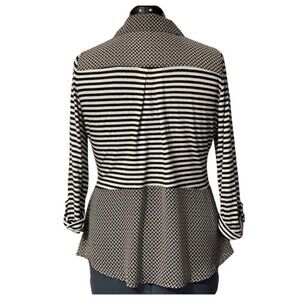 ROZ & ALI ~ Women's black and white multi-patterned button front blouse. Size Petite XL. Sleeves have roll tab cuffs. Shirt-tail bottom. Stretch. Chiffon bottom contrast. Soft and slinky.