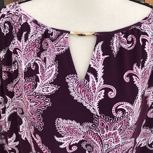 ROZ and ALI tunic top with keyhole neckline and gold accent. Tunic length, loose fit. Colors are burgundy, cream. Size M. Elastic at the wrists, paisley print.