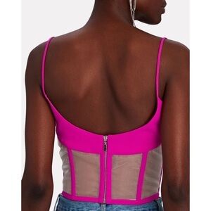 ROZIE CORSETS Crepe & Tulle Corset Fuchsia Pink. Embracing vintage corsetry for a night out, the label crafts a boned update to your going out top with barely-there mesh. The top's base is made of mesh, while the bodice and stitched tunnels are made of soft crepe.