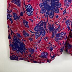 Pink and blue printed sleeveless tunic tank top. Paisley and floral print allover, low plunge back, pullover styling.