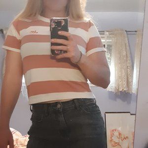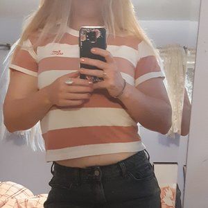 RPM Mfg Co. Sophie Tee - Rose Stripe Tee. Pink and white striped tee from New Zealand. NZ size 10/US size 8. My measurements are 35 - 28 - 39 and the hem comes down to my belly button area. It fits like a crop top on me. The shirt is 19" long from top of collar to hem and 17.5" wide at the hem. 100% cotton.