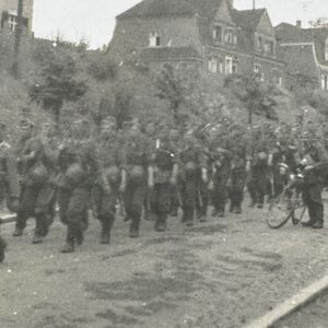 This is a real photo postcard featuring military soldiers marching in Bangladesh apparently during World War I. The postcard captures a historical moment of soldiers in action, possibly during a military parade or training exercise. The image is a genuine depiction of the era and provides a glimpse into the military history of the time period, making it a valuable collectible for those interested in wartime memorabilia.