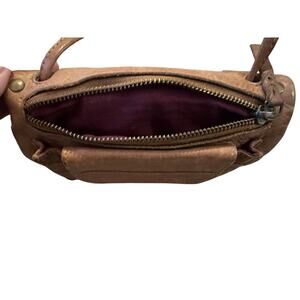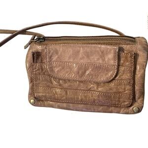 Brown distressed leather w/ exterior card slots, snap pocket, and zip closure. Plum fabric lining. Can be worn crossbody or as wristlet.