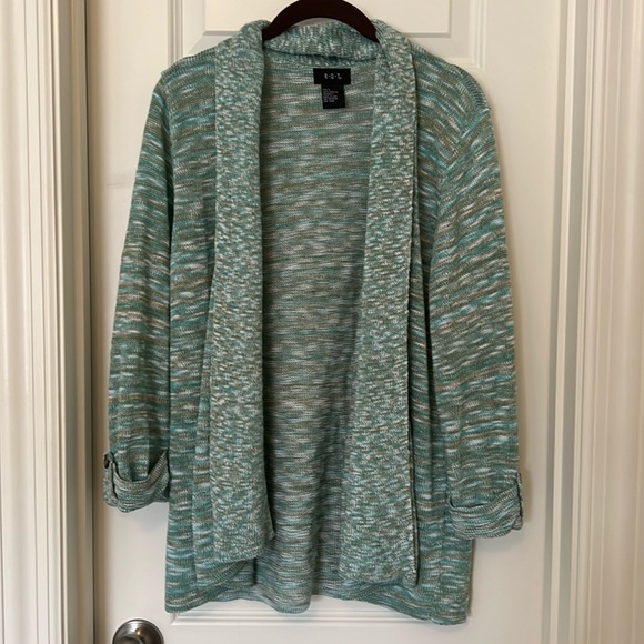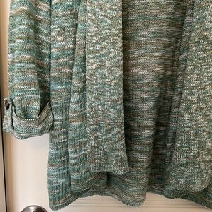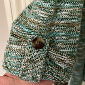 RQT cardigan. Green marled pattern. Lightweight. A great layering piece. Cute button details on cuffs of sleeves. VGUC. Minimal pilling under arms. Pretty color for spring!