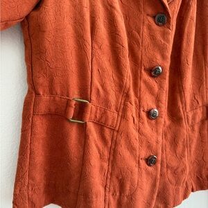This dark orange blazer features a lightweight textured fabric and a classic notched lapel design. Its cropped length and decorative buttons make it ideal for both professional and casual settings.