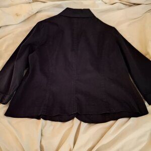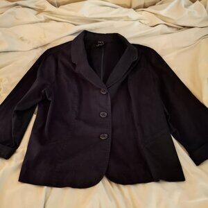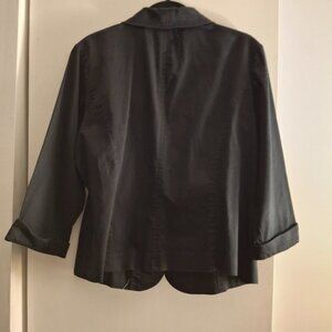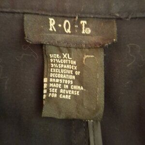 R.Q.T. women's black blazer is crafted from a smooth fabric, offering a subtle sheen that enhances its formal appeal. The classic lapel collar and tailored fit create a sophisticated silhouette, while the slight flare at the bottom adds a touch of modern style. Size XL. Pit to pit measures 20 inches. Length 23 inches.