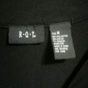 Black scoop neck top with pleats around the neckline, 3/4 length sleeves, 60% polyester/33% rayon/7% spandex