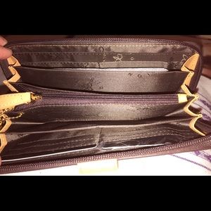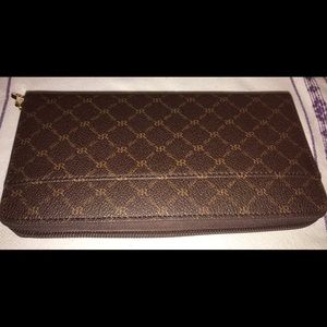 Small enough to be a wallet, big enough to be a clutch to go with whichever mood you're in. Embossed with gold RIONI Moda Italia emblem. Rioni monogram lining. Outside contains two side pockets, one with button closure. Zip around closure opens to goldenrod RIONI print lining with six dividing compartments, center coin holder, and twelve credit card holders. Also comes with a detachable identification card holder.