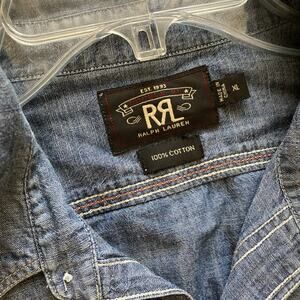RRL Button Up Shirt Mens Sz XL Chambray double RL Blue Western Cotton in great preowned condition no rips holes or stains. The extra buttons on the inside are broken just a side note.