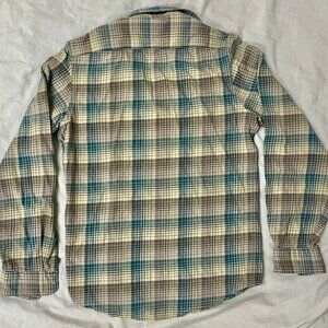 THIS IS A RRL & CO / RALPH LAUREN 100% COTTON LIGHTWEIGHT FLANNEL WORK SHIRT IN A FANTASTIC BLUE / BEIGE / GREY PLAID. IT WAS WORN ONLY A NUMBER OF TIMES WITH NO STAINS, HOLES OR DAMAGE. IT IS A SIZE SMALL AND FITS AS SUCH. RETAILS AT RRL & CO CURRENTLY FOR $275.