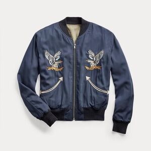Incredibly rare Ralph Lauren RRL bomber jacket featuring embroidered eagle motifs, curved Western-style pockets, and a reversible design. Japanese twill exterior with ribbed cuffs and hem. One side features navy eagle embroidery and arrow pockets; reverse is clean tan with welt pockets.