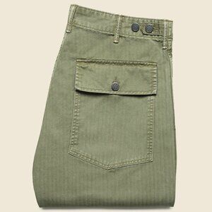 The RRL Army Utility Pant is a made of lightweight herringbone twill, garment dyed & hand-distressed to create a soft, lived-in feel. Oversized front patch & back buttoned pockets, and adjustable button waist tabs provide military-style function without overdoing it. A mid-rise waist with a tapered leg, this is a take on a classic men’s style, tailored for a female figure.