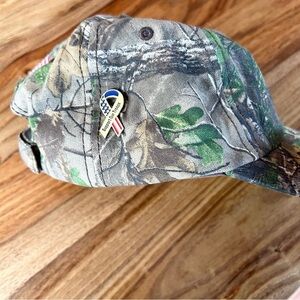 Features forest camouflage print, RSM Classic logo on front, American flag patch on back, gold stars and stripes ribbon pin on side. Adjustable Velcro back.