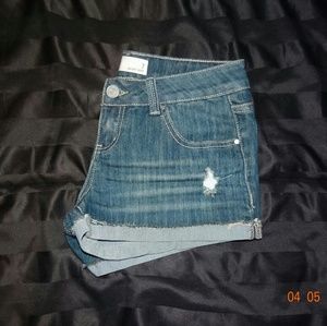 This item is used but still in good condition. Blue Jean shorts in woman's size 7. They have a distress look.