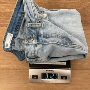 High rise light wash jeggings, frayed hem, distressed holes at both knees and bottom hem edge detail with a “shark bite that is higher in front.” Button and zip fly, hand pockets and back pockets, logo patch.