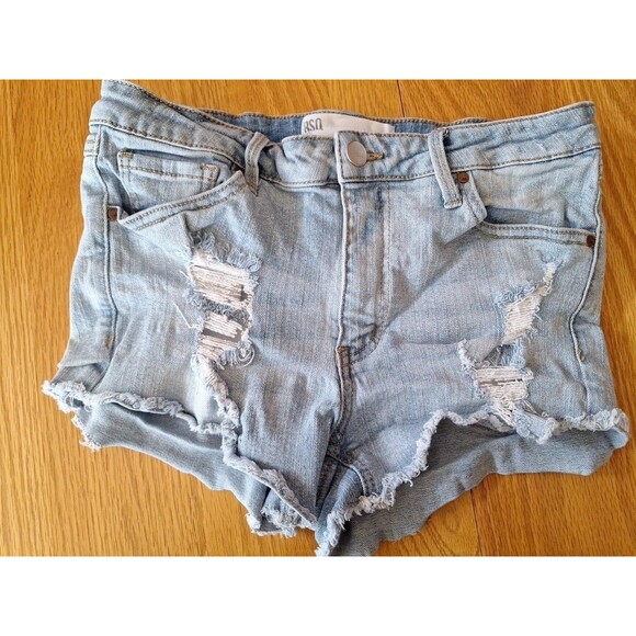 RSQ Jeans Womens Sexy Blue Wash Denim Shorts Sz 7 Cut Offs Distressed Mid Rise
