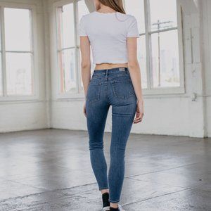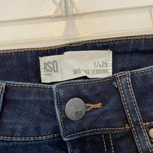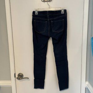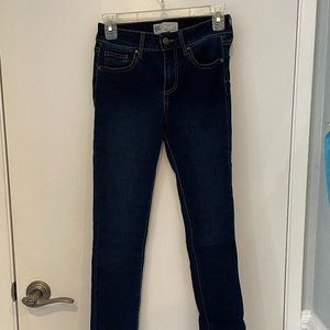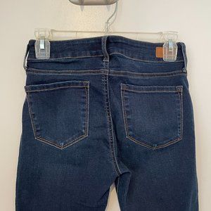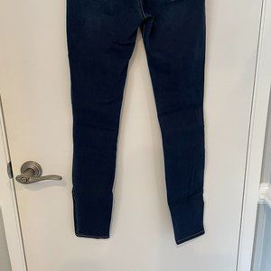 This is a mid rise dark wash jean with no distressing. It has a skinny fit and has hardly ever been worn. Size 25.