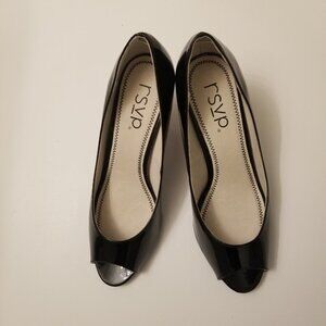 RSVP black patent leather peep-toe heels are a size 9.5 W. The heels are pre-loved and in great condition and the heel height is approximately 3 inches.