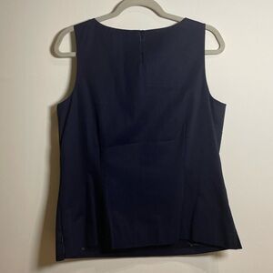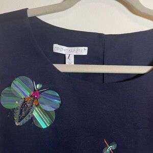 Different insects adorn the front of this shell top. Tank style top. Side zip closure. Small side slits. Lined. Rich indigo blue fabric. Hand sequin embellishment.