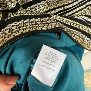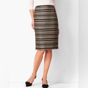 Add a festive touch to your wardrobe with this RSVP by Talbots pencil skirt. Features a bold black, white, and gold metallic jacquard stripe pattern with a sleek teal lining. Tailored fit with a hidden back zipper. Perfect for holiday parties, events, or elevated office looks.
