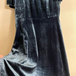 Elegant RSVP by Talbots navy blue velvet dress featuring short flutter sleeves, a scoop neckline, and a softly fitted waistline for a flattering silhouette. Fully lined with a concealed back zip. Luxurious sheen and drape — perfect for holiday parties, weddings, or evening occasions.
