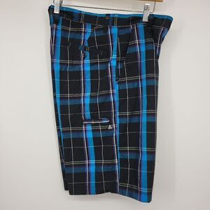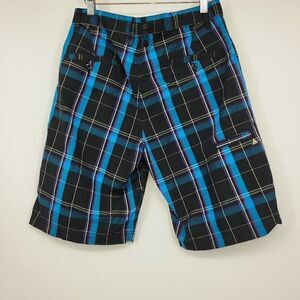 size 30 blue,black,white and purple waist 15.5" times by 2 length 21" Inseam 11" good condition # B 69