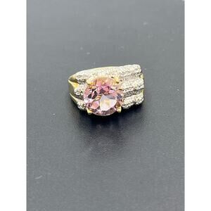Rose de France amethyst as its centerpiece, beautifully set in 925 sterling silver with luxurious gold vermeil overlay. The ring features an elegant asymmetrical design that perfectly frames and enhances the natural sparkle of this prized gemstone. The centerpiece Rose de France amethyst displays the signature soft pink-to-pale-lavender hues that make this variety so highly sought after by collectors and jewelry enthusiasts. Rose de France amethyst is rarer and more valuable than standard purple amethyst, making this piece particularly special. Flanking the center stone are delicate diamond chip accents arranged in an artistic, asymmetrical pattern that adds dimension and sophisticated sparkle to the overall design.