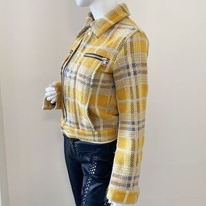 Stylish yellow plaid jacket featuring a front zipper and button details. Perfect for a chic look.