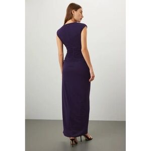 Rent the Runway previously worn piece, but in excellent condition. A knotted wrap waist gives this royal purple gown by Halston the perfect hourglass silhouette. Style with statement jewelry to bring this simple but elegant dress to life for any event. Purple jersey (100% Polyester). Column. Sleeveless. Crew neck. Back zipper closure. Size 2.
