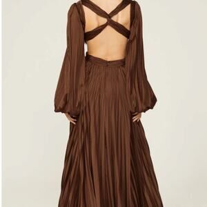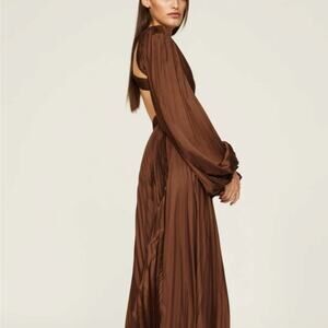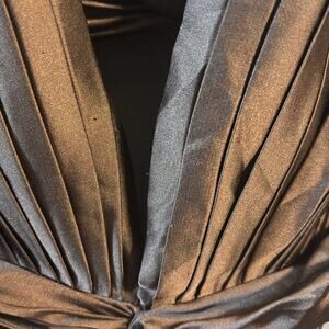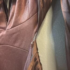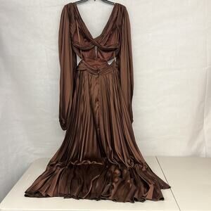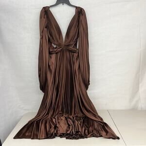 Details: women’s satin like chocolate brown formal gown. Backless with crossover pieces that attach to clasp. Long sleeves with elastic banding around wrist, pleated design and low V-neck. Zippered back and clasp. Built-in inner slip. Pleated cutout long gown