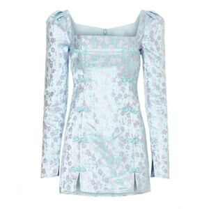 Product Details: sau Lee blue silk dress with purple flowers. Long sleeve mini dress. Approx 17" pit to pit. Blue floral jacquard (55% Polyester, 45% Nylon). Hourglass. Long sleeves. Square neck. Back zipper closure.