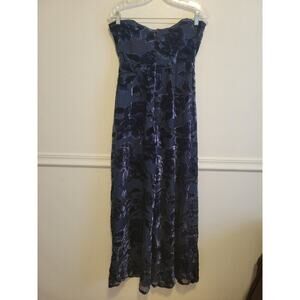 Product Details: Blue floral velvet (80% Viscose, 20% Nylon). Jumpsuit. Sleeveless. Sweetheart. Back zipper closure. Approx 16.5" pit to pit. Wide leg.