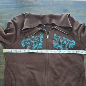 This women's XL zip-up jacket by RU Cowgirl combines style and comfort. Featuring a rich brown hue with a striking turquoise graphic design, it is crafted with ribbed cuffs, collar, and hem for a snug fit. The long sleeves and functional pockets add practicality to its chic appearance.