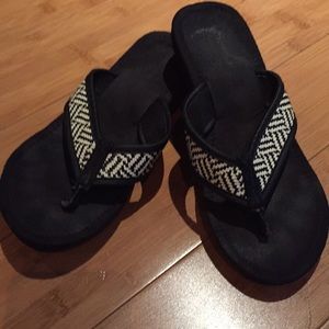 Knock around black and white weaved flip flops. They are worn but still have life. No size inside but they are a 6