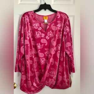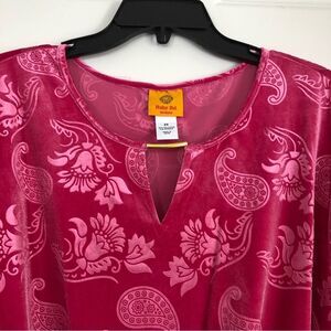 RUBY RD. PAISLEY VELVET EMBOSSED TEE PLUS SIZE 2X PINK KEY HOLE NECK 3/4 SLEEVES