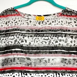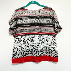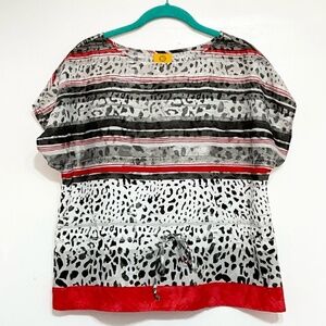 Stylish RUBY RD Petite Small blouse with a bold mixed animal print and stripe pattern in red, black, and gray. Lightweight polyester with short sleeves and a drawstring waist for a flattering fit.