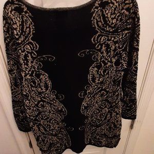 RUBY RD Sz L Black with Gold Filigree 3/4 Sleeve Tunic SWEATER, NWOT! Soft, comfort fit scoop neck, side slit. Great for holidays! Wear to the office and out to Celebrate after!
