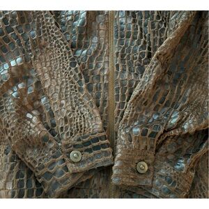 Nice jacket with a unique style. Two flap pockets in front, full zip, hip length. The faux leather is black and the suede is brown making an animal print pattern. Very