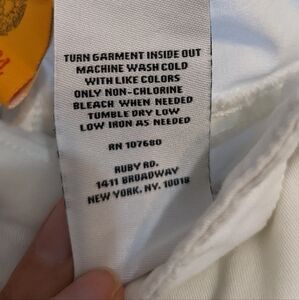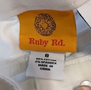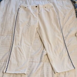 Ruby road bright white cropped pants with royal blue and dark blue stitching detail on the side. two front pockets and a coin pocket to back pockets. button and zipper closure super cute and classic. size 8 they have a decent amount of stretch. and the waistband on the inside is elastic. unstretched the waist measures 15 and 1/2 in, the rise measures 10 in, and the inseam measures 21 and 1/2 in