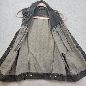 Stylish gray denim vest with checkered pattern. Features button closure and front pockets. Sleeveless design for versatile wear.