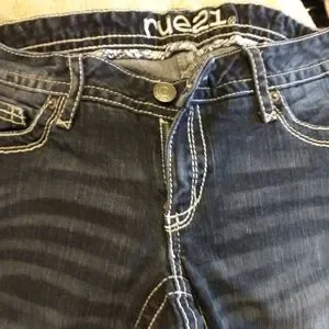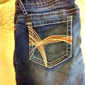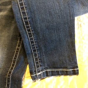 Size 5/6 low rise skinny jeans. These jeans are Jr size, they run smaller than misses and ladies. Great darker color with white stitching. Also has a darker yellow design on back pockets. Please look at pictures and ask questions before purchasing! This item is from a smoke and pet free home!