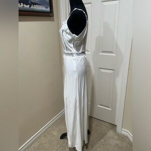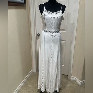WHITE RAYON SPAGHETTI STRAP SUNDRESS, WITH LACE MIDRIFF INSET, FRONT BUTTON DETAILS, FRONT SLIT, SIDE ZIPPER, LACE TRIM FRONT NECK EDGE, LINED SKIRT TO TOP OF THE FRONT SLIT, CRUISE, BEACHY, VACATION WEAR. PRE OWNED IN BEAUTIFUL CONDITION