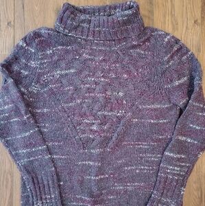 Ruff Hewn cowl neck sweater. Multi-colored gray, purplish/maroon & white with front cable knit design. Women's size XL, approximate measurements are 22" from front pit to pit, 26.5" from front neck line (without cowl neck) to bottom hem, 29.5" from back neck line to bottom hem. 63% acrylic, 25% wool, 12% polyester. Excellent condition.
