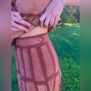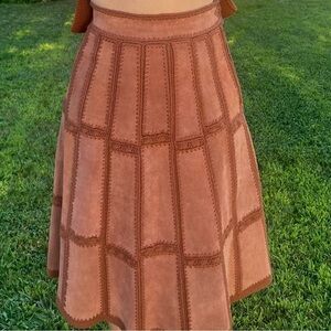 Ruffians women’s 1960’s vintage two-piece set is absolutely beautiful. This patch work leather skirt and vest/blouse is a very rare find. Perfect for patio gathering or dressy occasions any time.